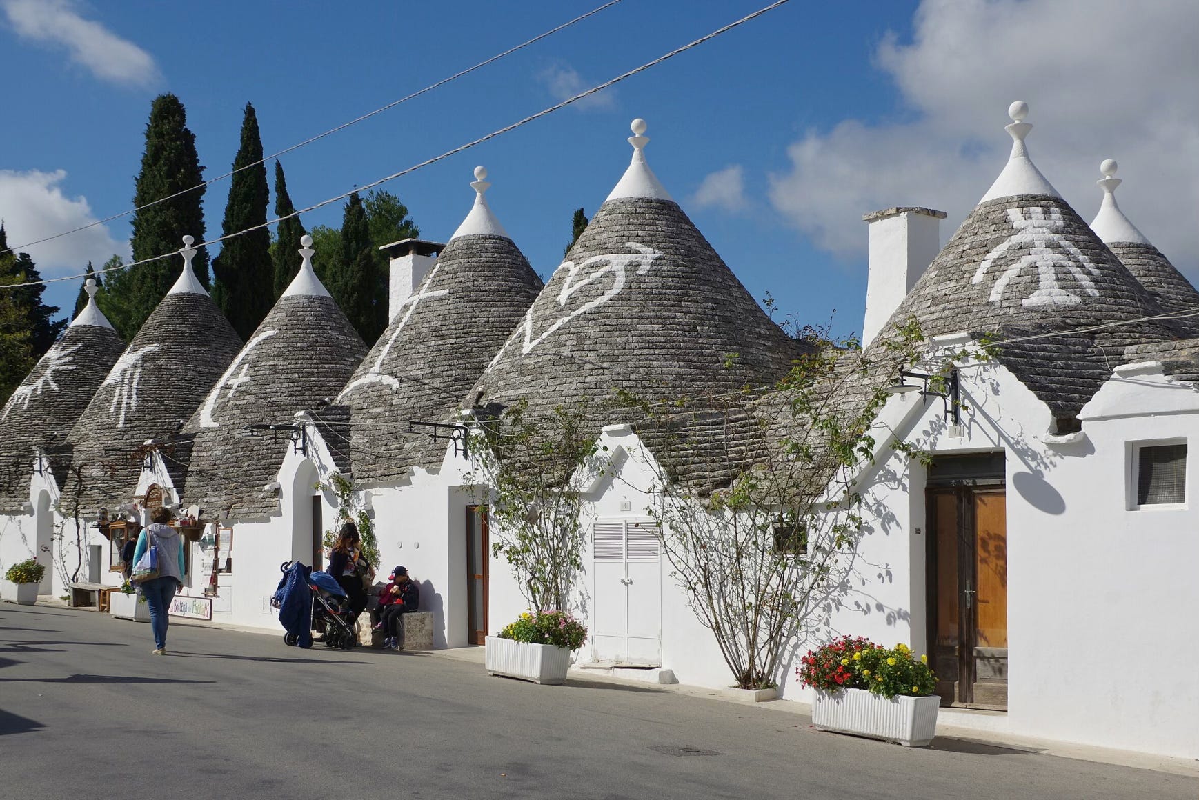 If you have not had the privilege of sleeping in a trullo, permit me to offer this observation. It is like sleeping in a tomb. (Okay, I have never slept in a tomb … I presume it is like that.) The origin of these structures dates back a thousand years, though most of the surviving homes were built in the 14th century. They were built using local stone and without mortar, and were round. The theory is that they were constructed this way to evade the collection of taxes. When collectors approached, the ceiling could be dismantled by removing the keystone from the top, making it appear abandoned. The walls are typically whitewashed, contrasting beautifully with the gray rooftops, which are often decorated with figures of spiritual or superstitious meaning.